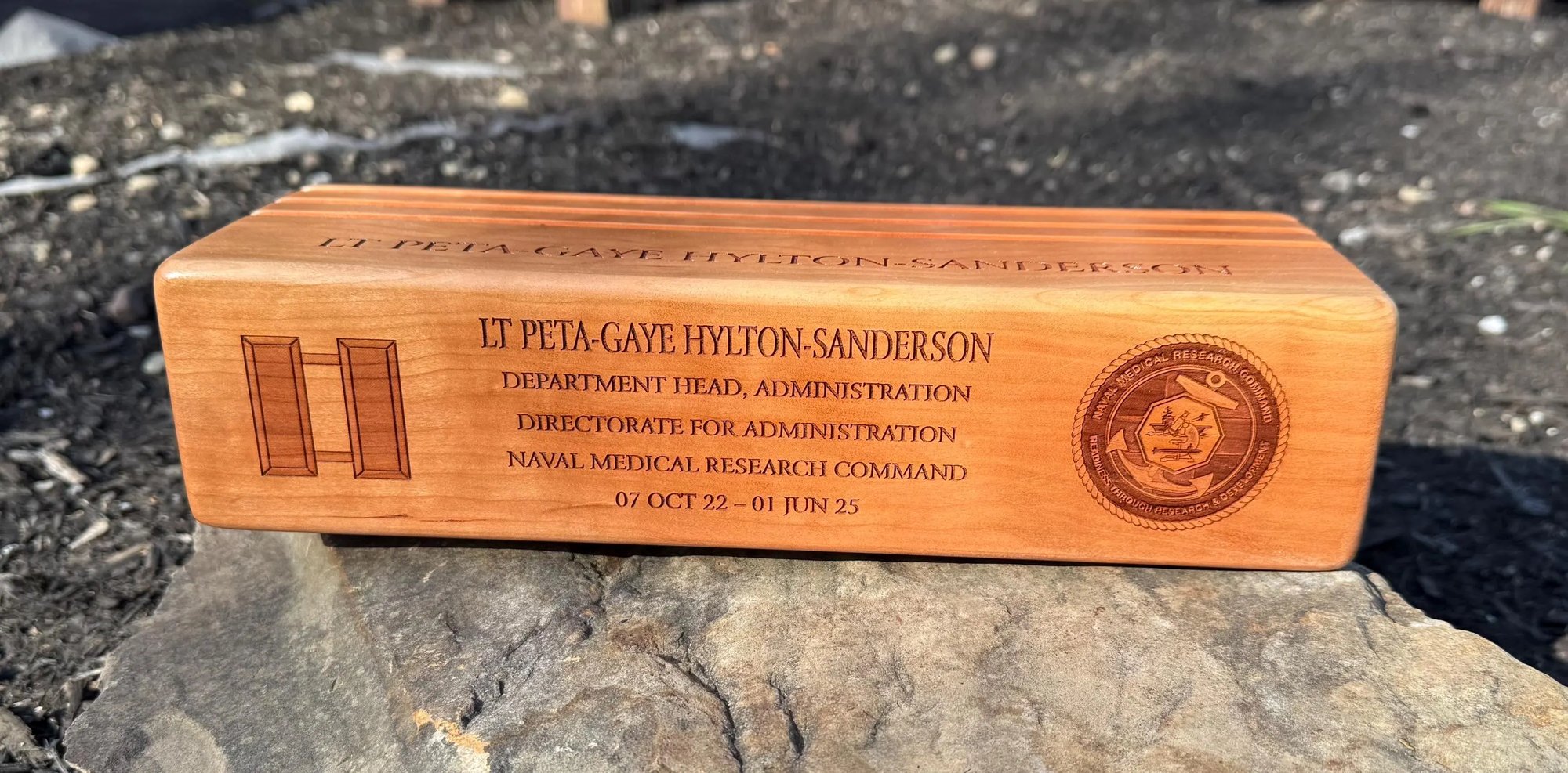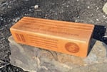 Solid cherry challenge coin rack with custom engraving. Navy, Coast Guard, Army, Marines, Air Force or engraved with whatever you would like! Made from a solid block of Cherry wood, laser engraved to order to feature your challenge coin collection. Price includes all engraving on top and front and all design work. Free ground shipping.
